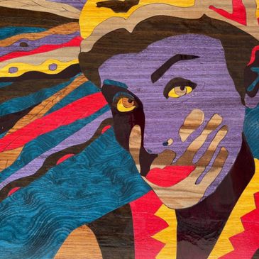 I use the influences of such masters as Van Gogh, Escher and Matisse for the visual designs and convert my images into Wood Marquetry Inlay Art. As far back as I remember I have always been surrounded by music, art and wood. In my father’s shop I sorted, sanded and swept wood. I breathed in the essence of exploration and creativity and even a few shop cuss words! I learned to identify, cut, shape, finish and appreciate glorious wood. It is imprinted in my brain, this gift that my father passed on to me. I’m releasing gifts that have been almost overlooked, hidden, only to be revealed in my Wood Marquetry Inlay Art. I have created wood inlay designs from my original drawings ranging from “Mushroom Lady” to a rocking “Kicking Up Dust.” Come dream with me these