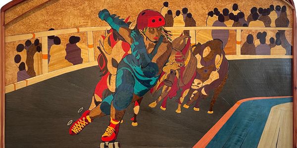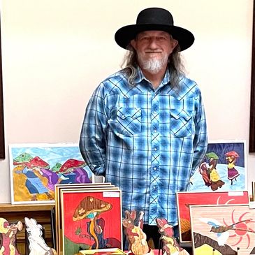 I design these marquetry pieces on a tablet, and then carefully cut the designs on a scroll saw and exacto knife from very thin 1/42” dyed veneer wood. Not computer or laser cut. Next I put together the art like a puzzle. There’s lots of trimming, sanding and finish work to bring you these amazing beauties. Wood Inlay designs and prints include fanciful mushroom ladies, cardinals, hummingbirds, road runners, turtles, cats, buffalo, rabbits, butterflies, lizards, bees, horned toads, scissortails, Choctaw legends: Stickball Players, Deer Women, Corn Women and other fanciful creatures! Wood veneers include: Ash, Birch, Cerejeira, Cumara, Etimoe, Ecualyptus, Imbuya, Dyed Koto, Lacewood, Madrone, Nutmeg, Oad, Paldra, Sapale, Spruce, Sycamore, Walnut and Zircote. Some pieces from "Yes I Can Roger" show are still available!